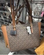 A stylish Michael Kors tote bag featuring a monogram design with brown and tan accents.