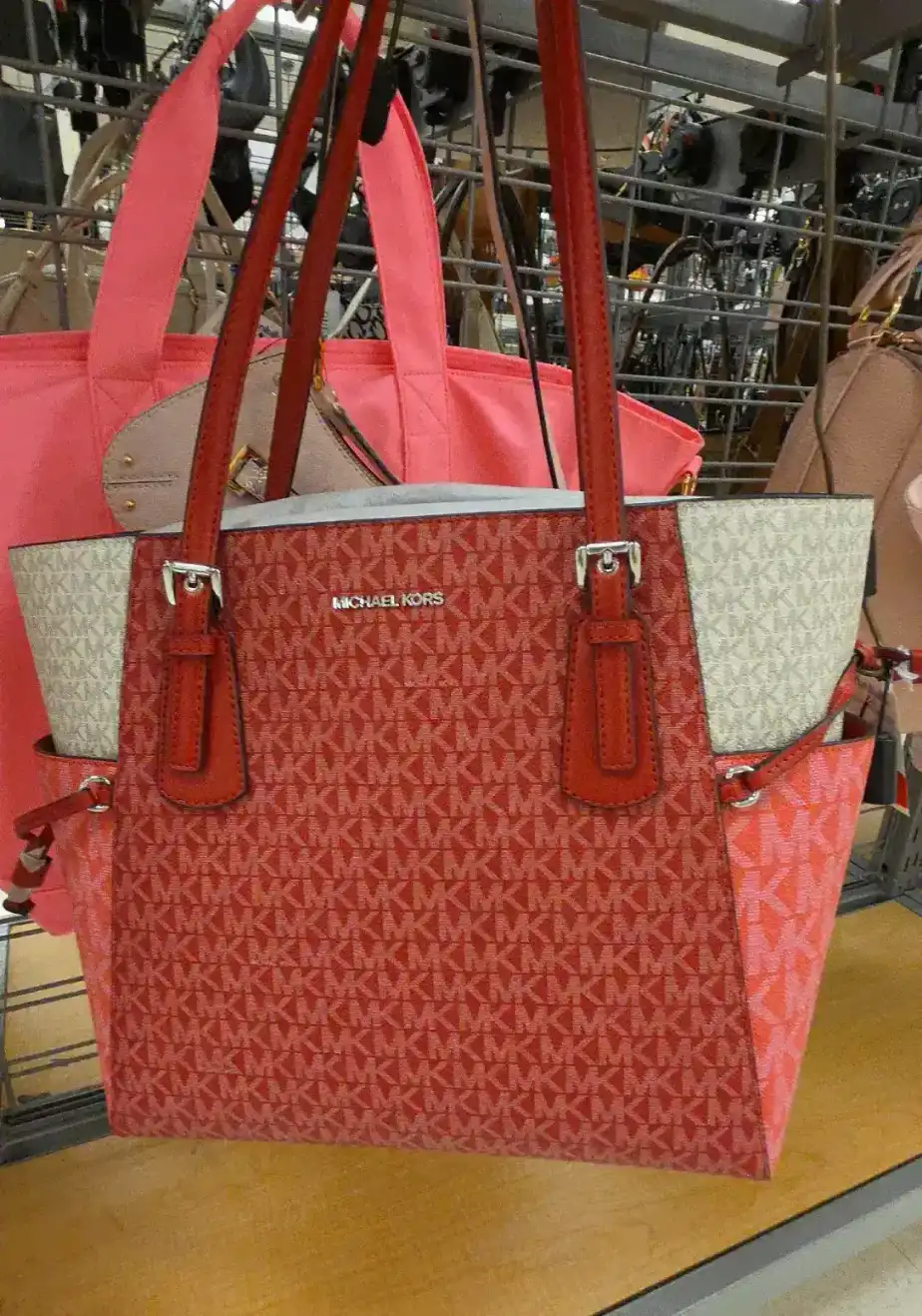 A stylish tote bag featuring a signature MK pattern in red and beige, perfect for everyday use.