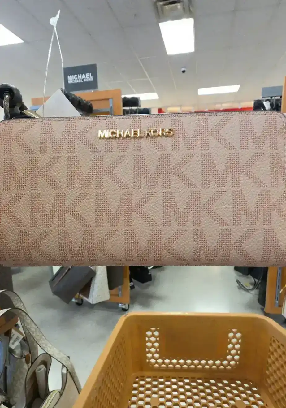 A stylish wallet featuring the iconic Michael Kors logo pattern.