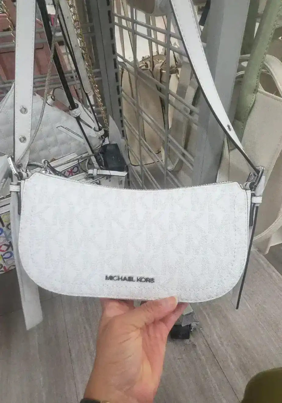A stylish white handbag featuring the iconic Michael Kors logo. Its sleek design makes it a versatile accessory for any outfit.