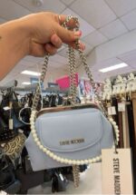 A stylish mini handbag with a chain strap and pearl detailing.