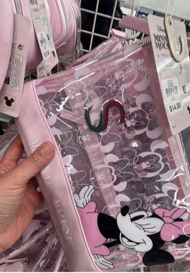A cute clear cosmetic bag featuring a Minnie Mouse design, perfect for organizing makeup and accessories. The bag has a pink trim and a zipper closure.