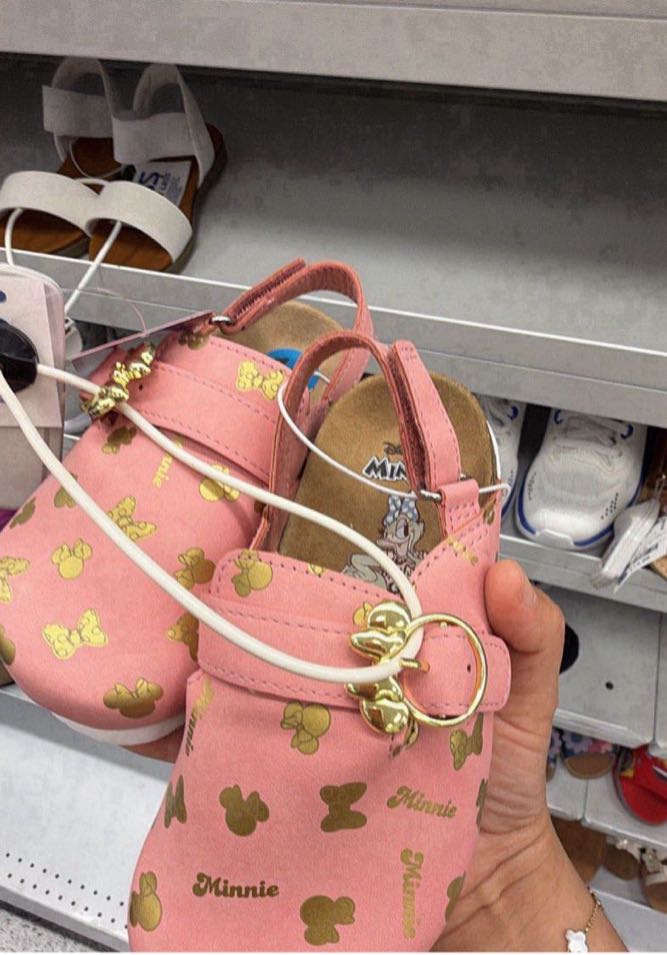 These adorable pink clogs feature a Minnie Mouse design with gold accents, perfect for little ones. They are comfortable and easy to wear for everyday activities.