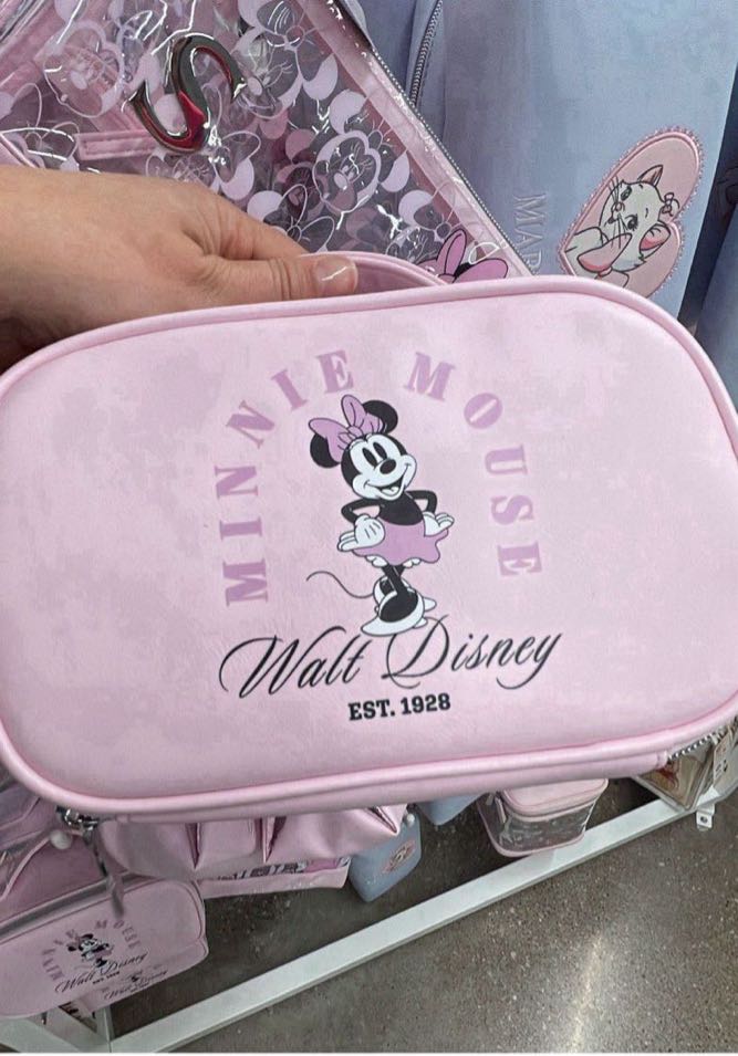 A pink cosmetic bag featuring Minnie Mouse and the Walt Disney logo. Perfect for storing makeup and other small items.