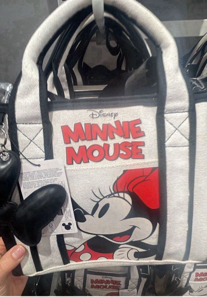 A stylish handbag featuring a vibrant Minnie Mouse design, perfect for fans of the iconic character. The bag is structured and has a durable construction.