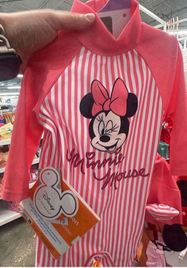 This adorable pink and white striped swim suit features a playful Minnie Mouse design, perfect for summer fun. Ideal for young fans of Disney.