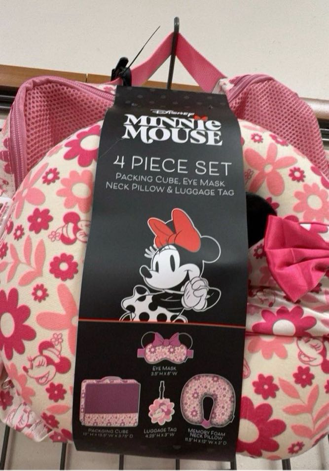 A 4-piece travel set featuring a packing cube, eye mask, neck pillow, and luggage tag, all adorned with a floral Minnie Mouse design.