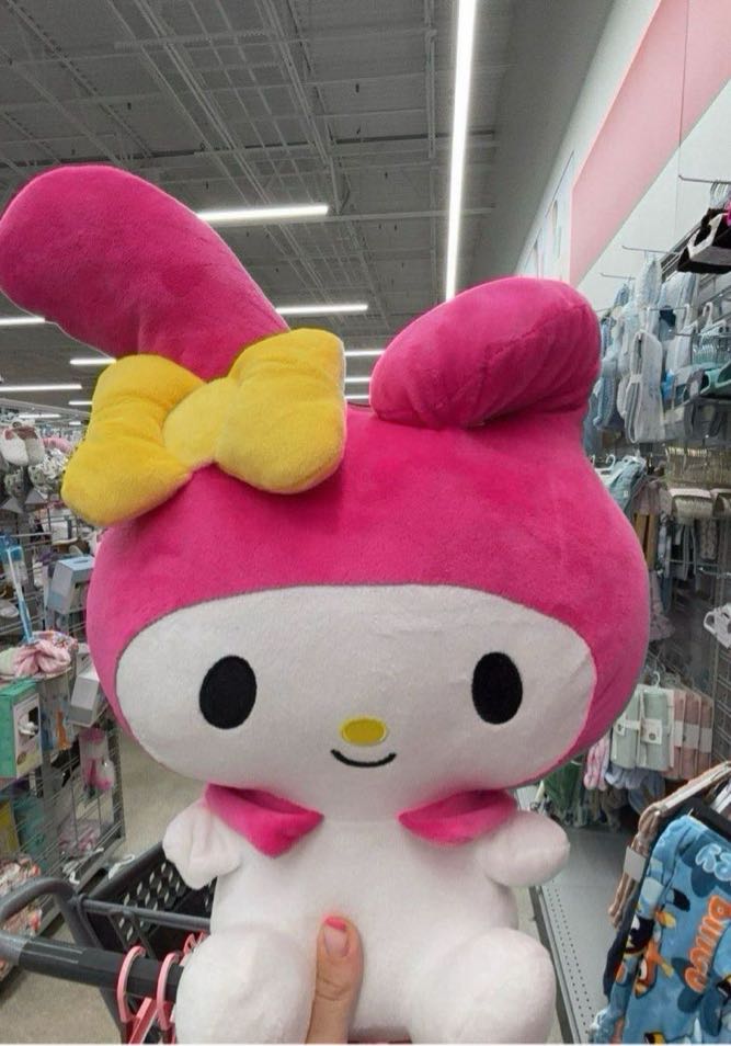 A large, soft plush toy of My Melody, featuring a pink head with a yellow bow and a white body.