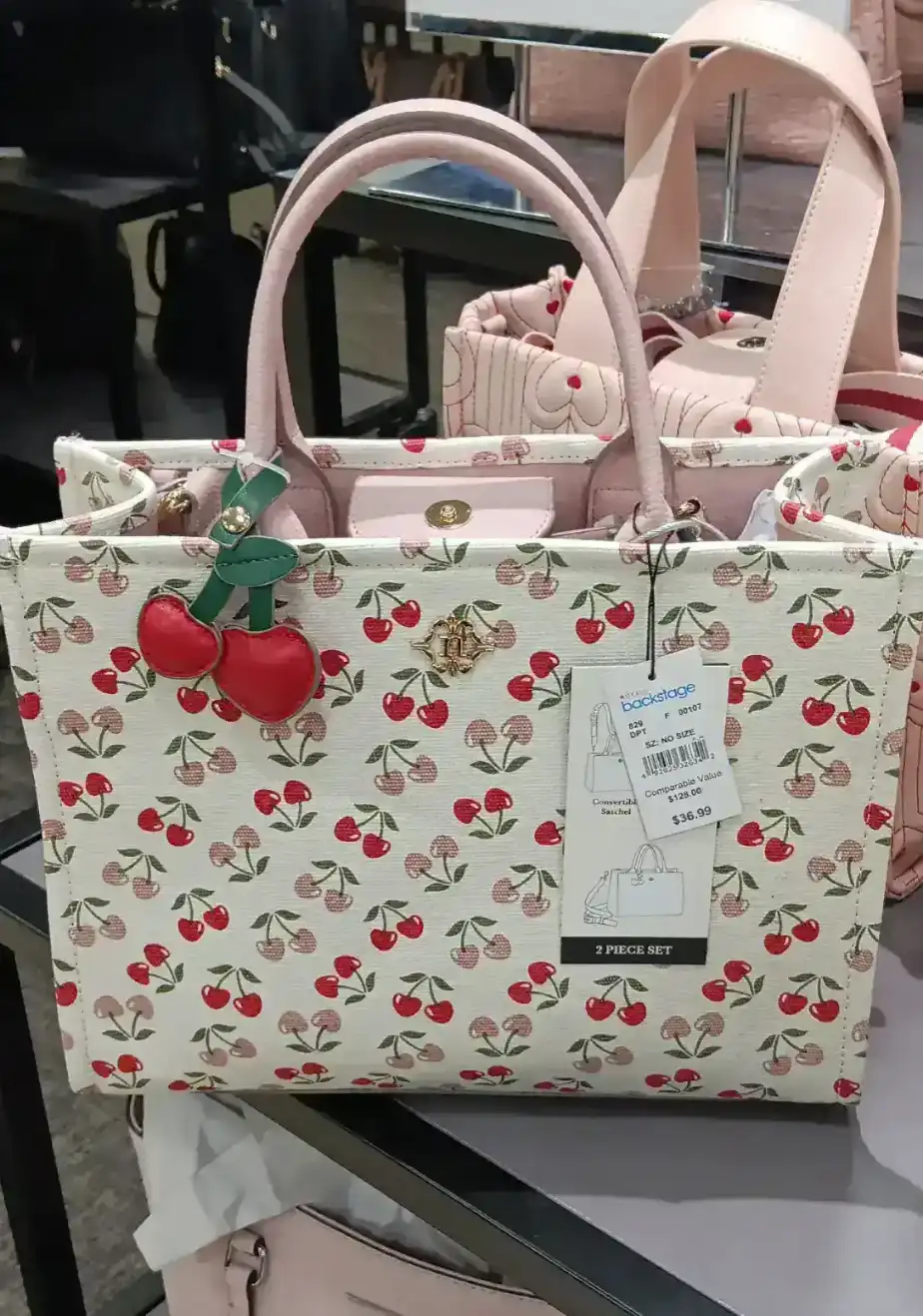 A stylish handbag featuring a charming cherry print design, perfect for adding a playful touch to any outfit. It includes a detachable cherry charm for added flair.