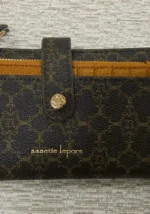 A stylish wallet featuring a monogram design with a gold-tone zipper and accents.
