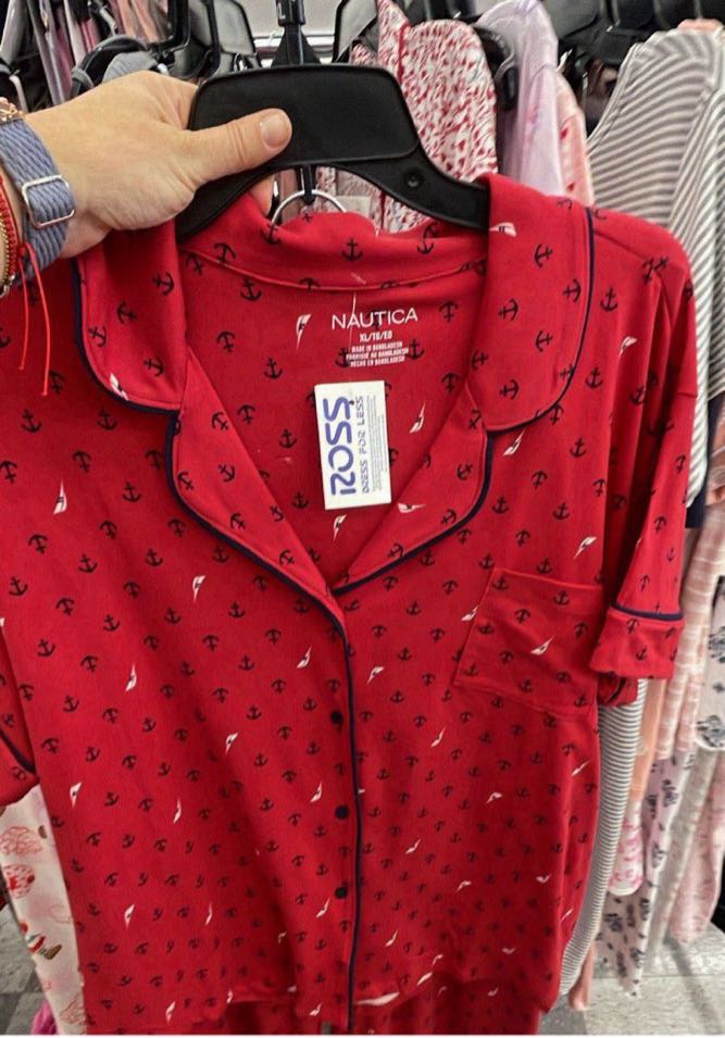 A comfortable red pajama set featuring a nautical anchor print, perfect for lounging.