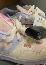 Stylish New Balance 550 sneakers featuring a pastel color scheme with a mix of pink and lavender accents.