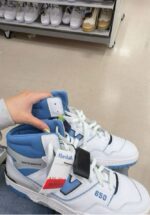 Stylish high-top sneakers featuring a white and blue color scheme.