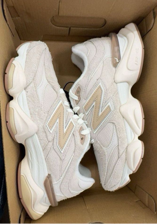 A pair of stylish New Balance sneakers featuring a soft, textured design in a light color.