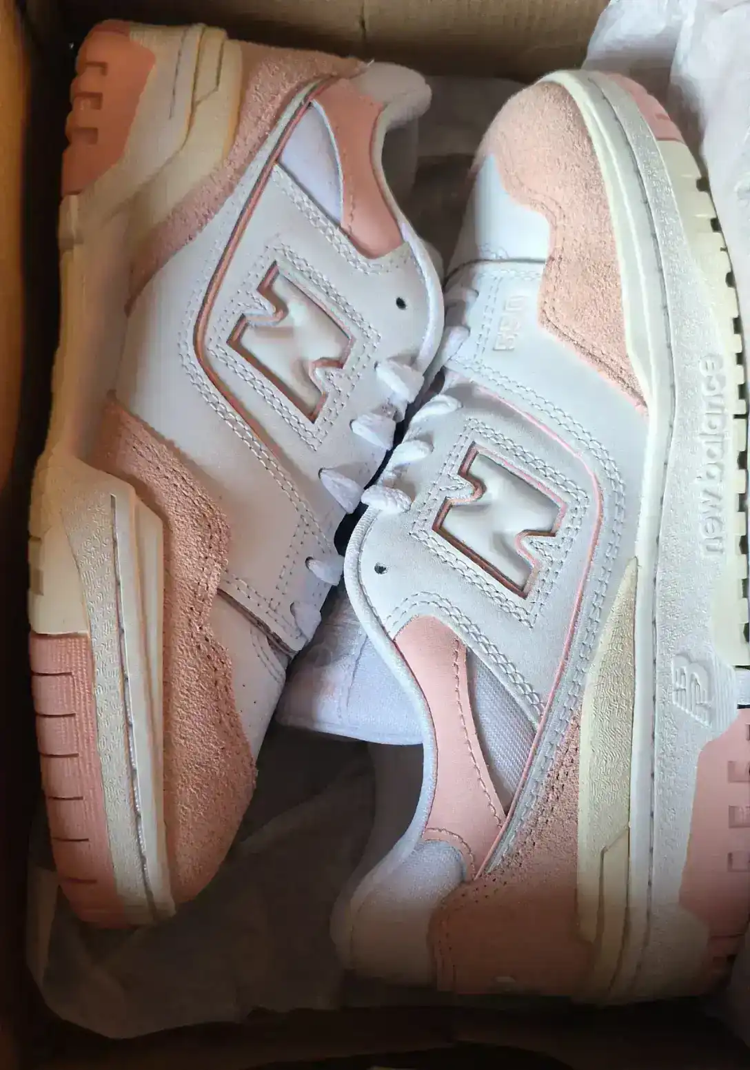 A pair of stylish New Balance sneakers featuring a combination of white and pink colors. Designed for comfort and performance.