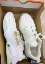 A pair of white Nike athletic shoes with gold accents, designed for comfort and performance.