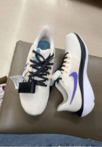 A pair of white and purple Nike running shoes with black laces.