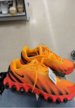 Vibrant orange and black Nike Shox R4 sneakers with a unique cushioning system.