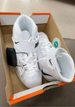 A pair of white Nike athletic shoes designed for performance, featuring a secure strap and breathable mesh.