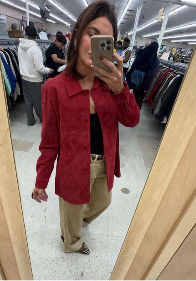 A stylish red suede jacket with a button-up front and a classic collar.