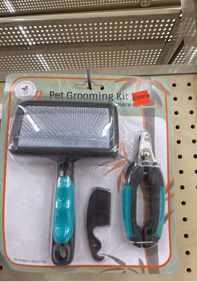 A grooming kit for pets that includes a brush, comb, and nail clippers.