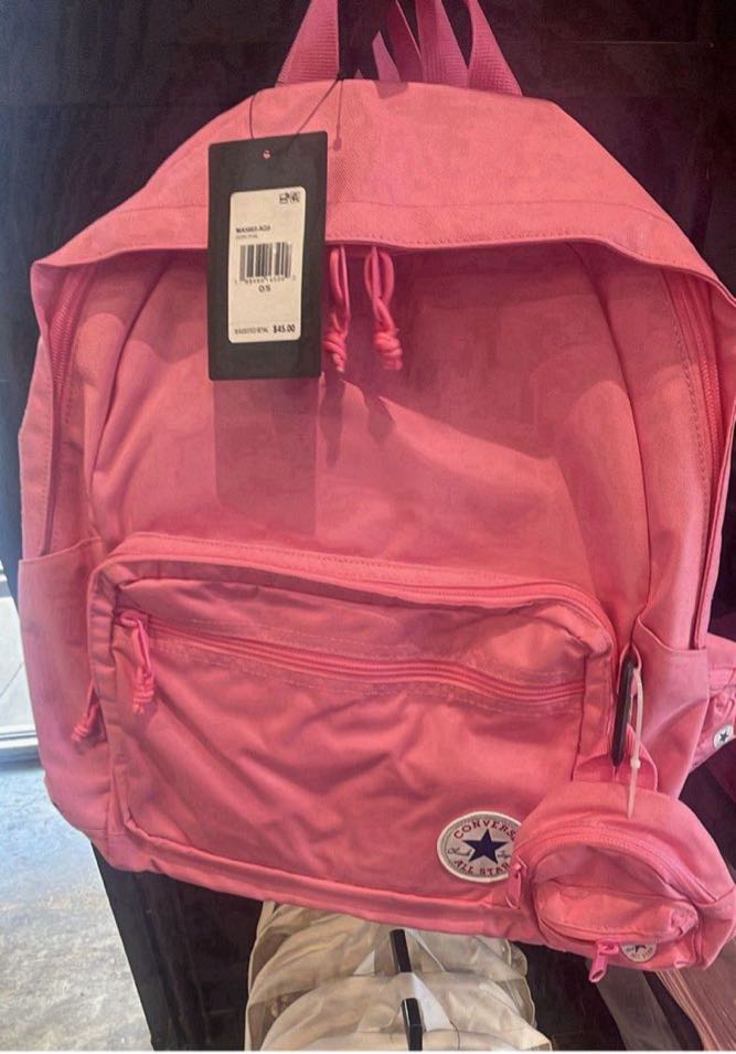 A vibrant pink backpack with a front pocket and a small detachable pouch.