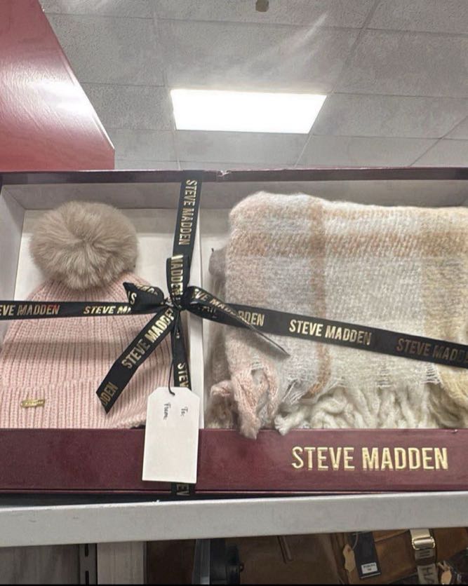 A stylish pink beanie with a pom-pom and a matching scarf, perfect for winter.