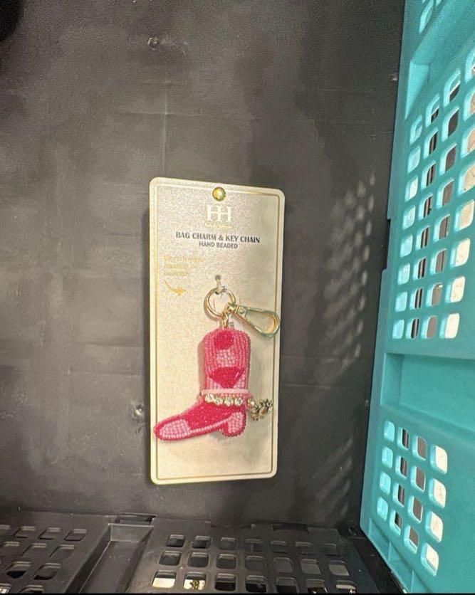 A vibrant pink boot-shaped bag charm, hand-beaded for a stylish accessory. Perfect for adding a fun touch to your bags or keys.