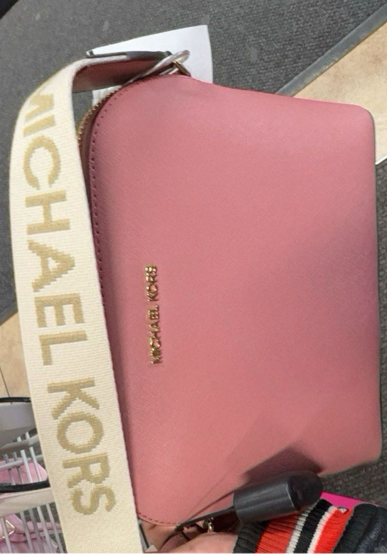 A stylish pink crossbody bag featuring a gold logo and a decorative strap.