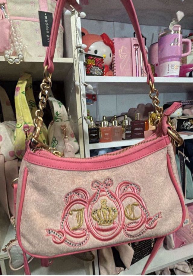 A stylish pink handbag featuring intricate embroidery and a crown design.