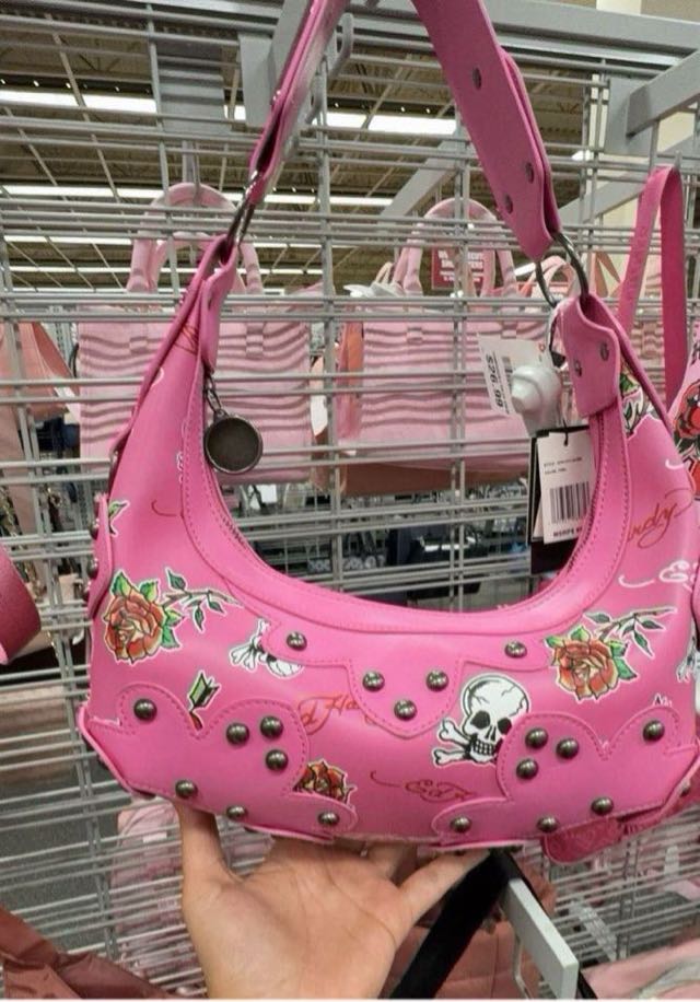 A stylish pink handbag featuring floral designs and a skull motif, adorned with studs.