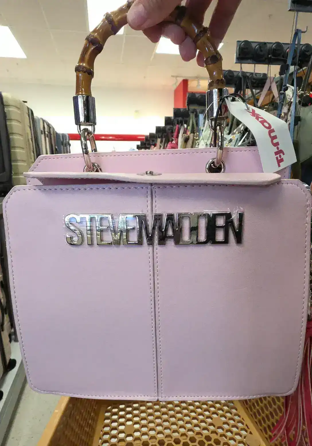 A stylish pink handbag with a bamboo handle and metallic logo.