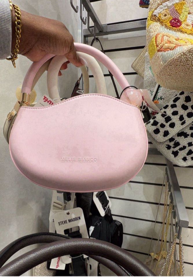 A stylish pink handbag with a unique curved design and a smooth finish.