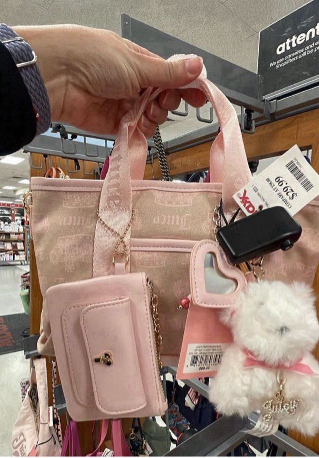 A stylish pink handbag featuring a detachable mini wallet and a cute charm. Perfect for everyday use or a night out.