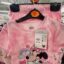 A stylish pink backpack featuring a repeating logo pattern and a detachable round pouch.