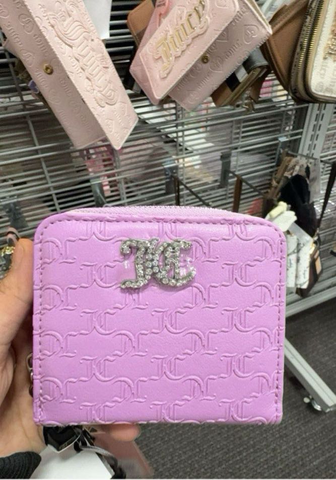 A stylish pink wallet featuring a textured logo design and a sparkling initial embellishment.