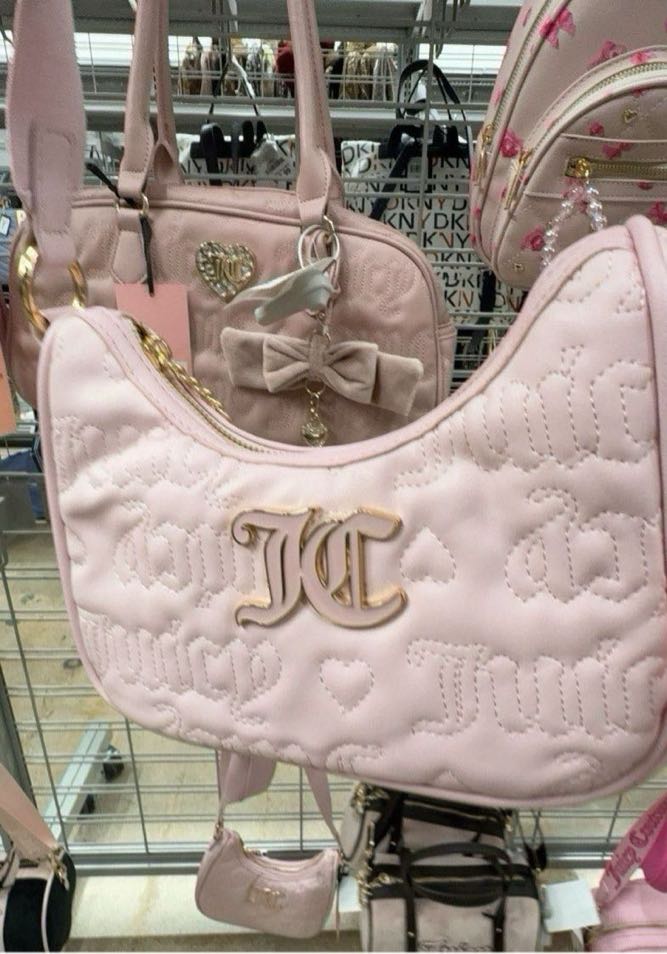 A stylish pink quilted handbag featuring a prominent JC logo and a chic design.