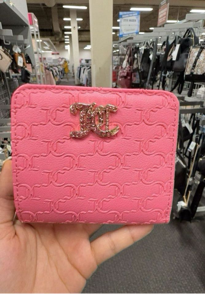 A stylish pink wallet featuring a textured design and a decorative logo.