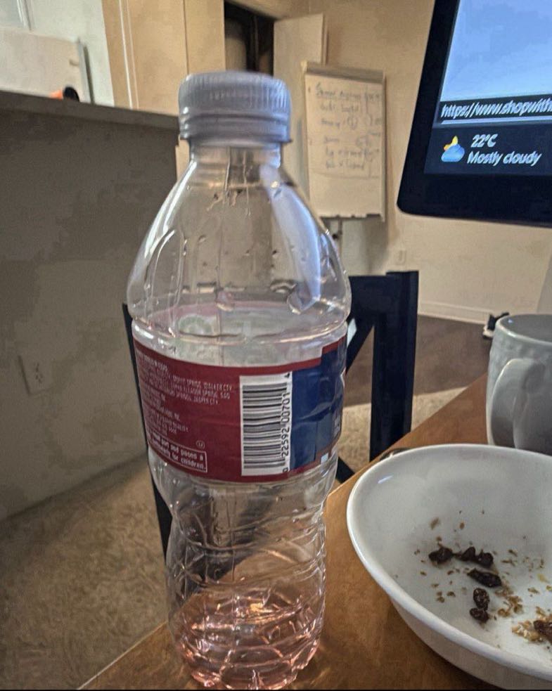 Clear plastic water bottle with a red label.