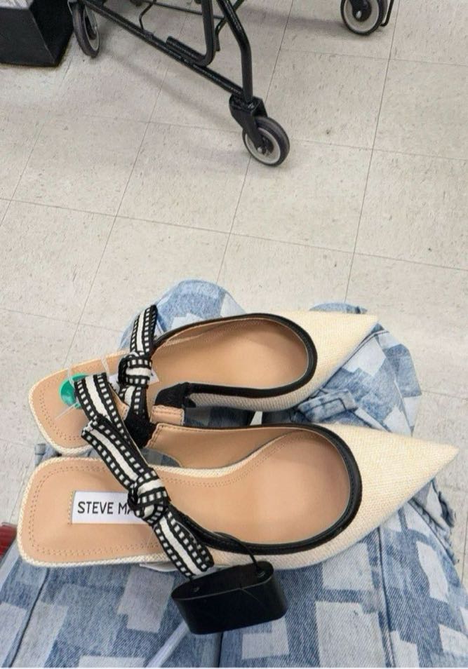 Stylish pointed toe slingback heels with a decorative bow and contrasting colors.