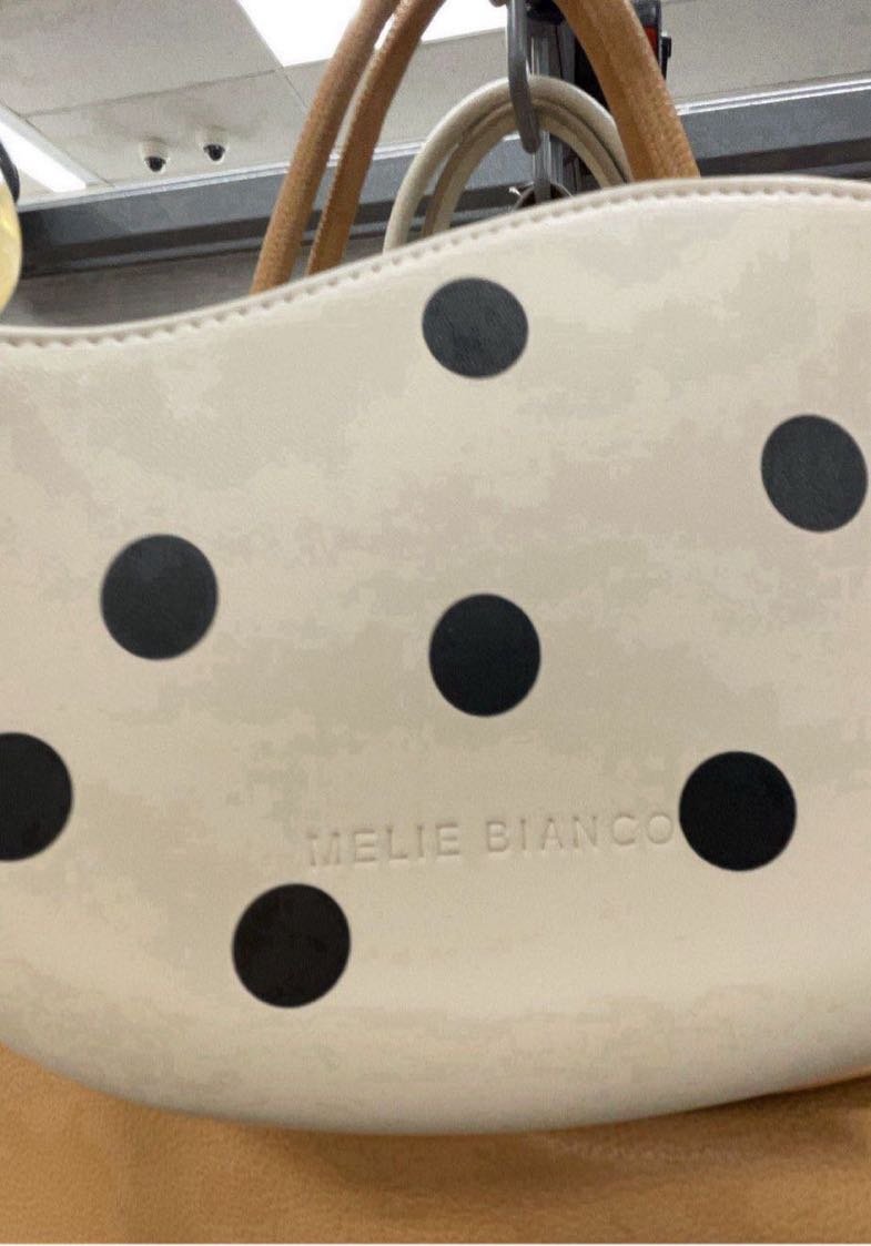 A stylish handbag featuring a cream background with black polka dots, designed by Melie Bianco.