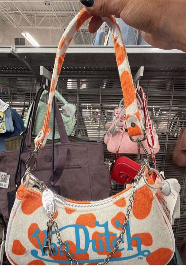 A stylish handbag featuring a playful polka dot design in orange and white, perfect for adding a fun touch to any outfit.