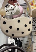 A stylish handbag featuring a cream-colored body with black polka dots, designed for a chic look.