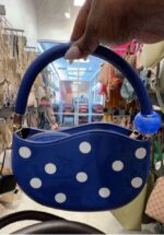 A stylish blue handbag featuring white polka dots and a unique handle design.