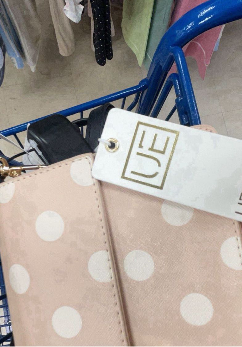 A stylish wallet featuring a pink background with white polka dots.