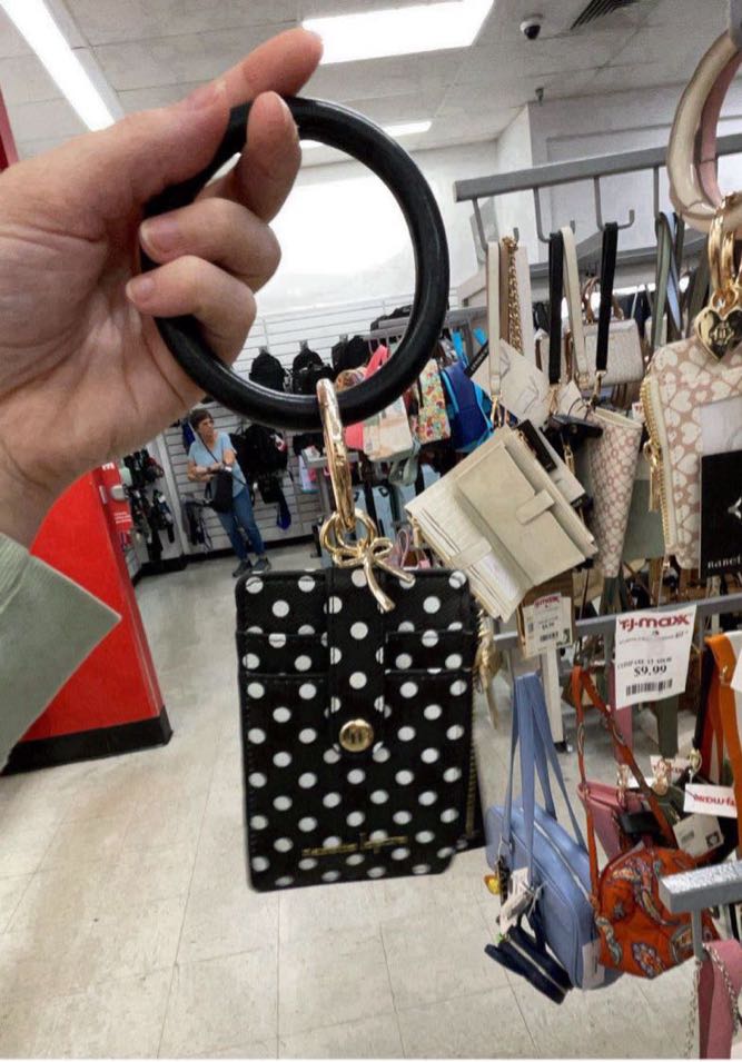 A stylish black wallet with white polka dots, featuring a ring handle for easy carrying.