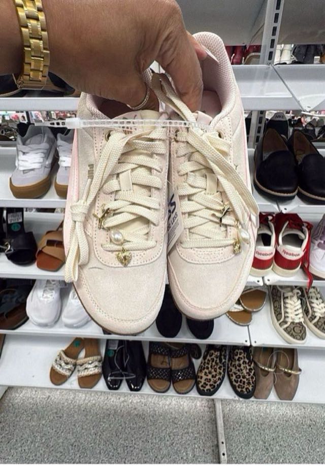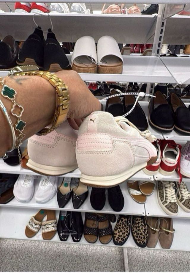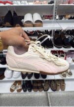 Stylish Puma sneakers featuring a soft pink and cream colorway, perfect for casual wear. Designed for comfort and style.