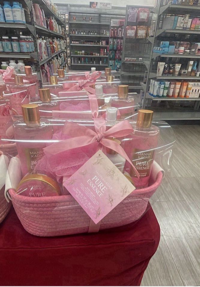 A beautifully packaged gift set featuring various skincare products, all presented in a decorative basket. Ideal for pampering and self-care.