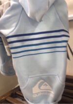 A light blue hoodie featuring horizontal stripes and a front pocket.