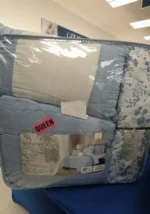 A queen-sized quilt set featuring a floral design in blue and white tones.